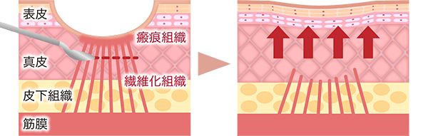 「サブシジョン」では、皮膚の表面から針を指して、皮膚を引っ張っている線維化組織を切断しニキビ跡の凸凹の症状を改善します。繊維化組織を切り離した部分にヒアルロン酸を注入する方法もあります。